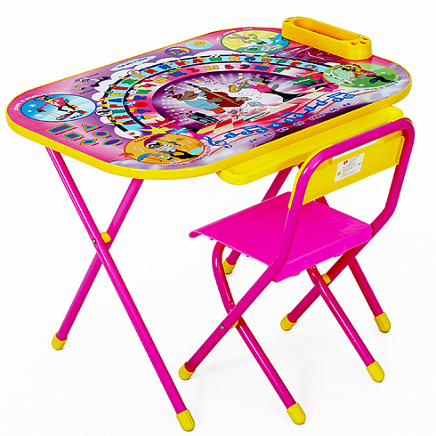 Набор мебели Дэми Всезнайка "Ну, погоди" выполнен по мотивам популярного детского мультика и состоит из 2 предметов: столика и стульчика. Набор идеально подходит для организации детских игр и занятий, как в дошкольных учреждениях, так и для домашнего использования. На столешницу парты, украшенной изображением любимых героев, нанесены буквы алфавита и цифры, что поможет ребенку легко подготовиться к школе. Также ребенок сможет выучить названия некоторых геометрических фигур и наглядно увидеть различия между временами года, дня и ночи.  После занятий при необходимости стол и стульчик можно сложить и убрать, что позволяет использовать его даже в малогабаритных помещениях. Предметы изготовлены из прочных и качественных материалов. Для безопасности углы столешницы скруглены.