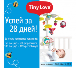 Акция Tiny Love – дополнительная скидка на перечень акционных товаров бренда при заказе на сумму от 100 000 рублей.